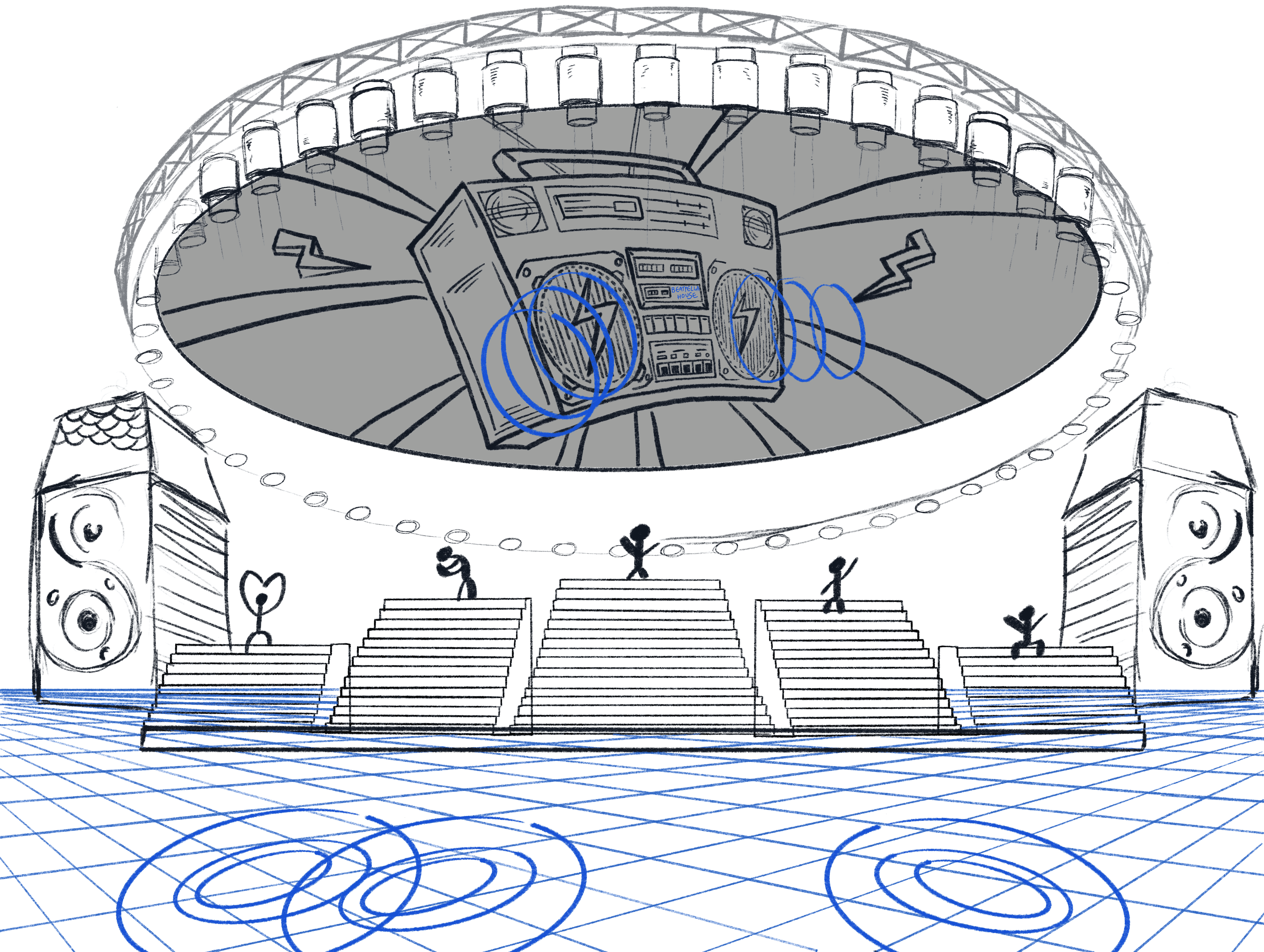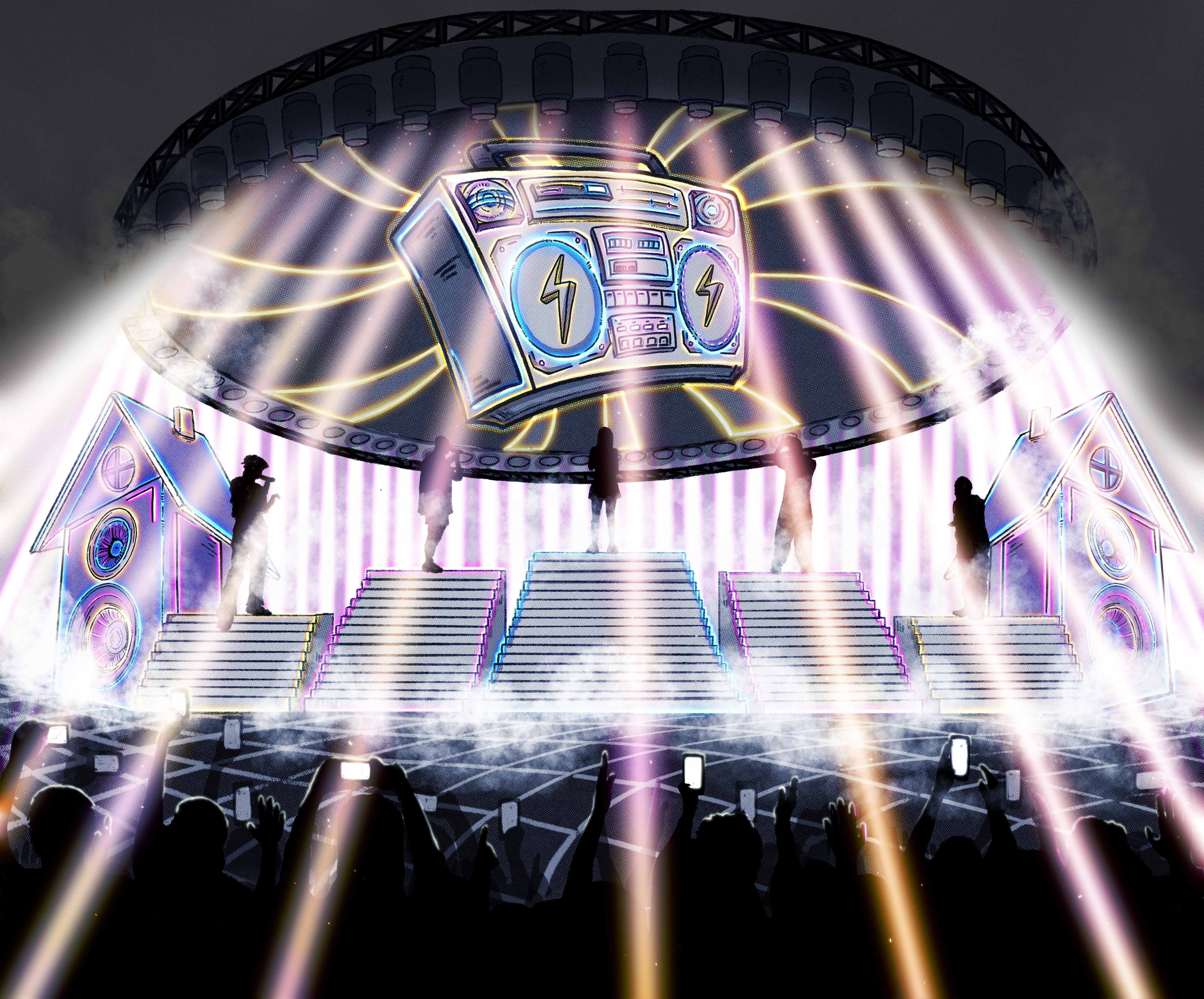 This stage design shines a spotlight on the a cappella heart of Beatpella House by showcasing each member’s unique position and vocal strengths. As a fan, I want to see their voices not just heard but felt interacting with the stage itself, because that’s the true power of the human voice. The set comes alive with light choreography and sound wave visuals that respond directly to each singer, creating a dynamic, immersive experience that visually echoes their vocal energy. Recurring motifs of a house and vintage boomboxes tie the design closely to the group’s identity.
